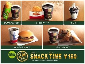 日本マクドナルドは、ハンバーガーなど100円メニューをドリンクとセットで購入すると、通常価格から割り引くキャンペーン「2時から スナック タイム ¥150」を実施中だ。