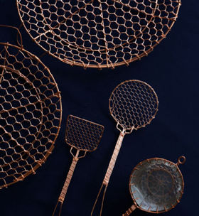 台所や食卓で活躍するものばかりではない。表具用の糊こしや陶芸用の土ふるいなど業務用の道具。大きなものでは神社仏閣の鳥除けの金網まで。しかし鳥井さんは、「日用の小さい道具をつくる方が好きです」という。一つひとつ手仕事の、手間を惜しまず丁寧につくられる金網細工。