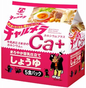 明星「明星チャルメラCa+まろやか豆乳仕立てしょうゆ」明星は、袋めんの「明星チャルメラCa+(カルシウムプラス)まろやか豆乳仕立てしょうゆ5食パック」を2008年5月7日に発売する。麺は1食当り牛乳約2.5本分のカルシウム(571mg)を練り込んだ。スープは、鶏肉と生姜やニンニクを炊き出したダシに、しょうゆダレと豆乳を加えた「まろやか豆乳仕立て」だ。価格は、税抜き500円。