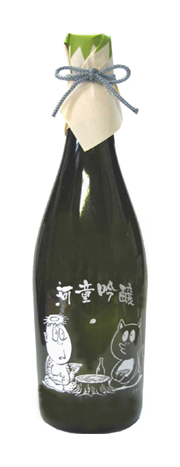 酒は、酒米「500万石」を使った純米吟醸酒。「河童の泉」に設置されたカッパとタヌキのブロンズ像のデザインを、瓶に彫りこんでいる。720ml入り。価格は2100円。