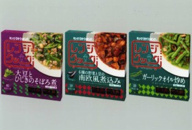 今回発売するのは、「大豆とひじきのそぼろ煮」「ガーリックオイル炒め」「6種の野菜と豆の南欧風煮込み」の3品。大豆とひじきのそぼろの場合は豚ひき肉と大豆、ひじきがパウチに入っているので、ほうれん草を加えて電子レンジでチンすれば完成だ。