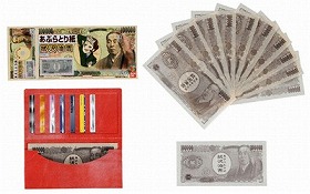 この商品はお札をイメージしたあぶらとり紙で、片面に「十万円」の文字と福沢諭吉似の「拭沢油吉」の肖像画が印刷されている。紙製の財布型ケースが付属しており、ここからあぶらとり紙を取り出せば注目度アップ間違いなしだ。