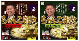 「ちゃんこダイニング若」で食べる「〆の雑炊」を商品化した。味は、鶏ベースのちゃんこスープと秘伝の合わせ味噌を加えた「秘伝の味噌」と、鶏肉と野菜の旨味が凝縮した「伝承の塩味」の2品。スープとご飯がセットになっており、電子レンジであたためて食べる。