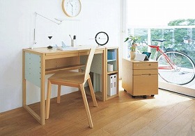 奥行き55cmの天板は子供の成長に合わせて5段階(標準身長120~180cm)で調節可能。天板の高さを最上段にセットすると、天板と側板、シェルフの高さがすべて揃ったフラットな平板になる。また、独立して設置できるオープンタイプのシェルフは、置き場所に合わせてレイアウトの向きが選べ、書棚としてはもちろん飾り棚としても使用できるという。