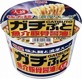 飾りっ気のないシンプルなパッケージ明星食品は、カップめん「明星ガチぶと魚介豚骨醤油ラーメン大盛」を、2009年9月14日に売り出す。がっちり太くて存在感のある極太麺と、豚骨醤油と魚介ダシの濃厚スープを組み合わせた、食べ応えあるカップめん。かやくは焼豚、メンマ、ネギといったオーソドックスなものに加え、タマネギチップとゴマが加えられている。価格は190円(税別)。