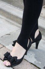 白・グレー・黒のグラデーションカラーのワンピースに黒のトレンカを合わせた、シックなモノトーンスタイル。ウエアはシンプルにまとめつつ、レースやレザータッセルのついたカゴバッグ、バングル代わりのシュシュ、お花のピアス、リボンつきのオープントゥーシューズなど、キュートな小物でまとめたラブリーなスタイルになっている。<モノウォッチ