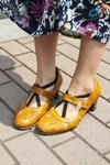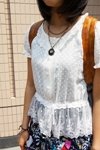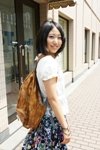 レトロな雰囲気のブラウスは、身頃が水玉、襟と裾とが透け感のあるレース素材を用いた清楚な雰囲気のアイテム。ボトムにはカラフルな多色使いのエスニックプリントのロングスカートを合わせている。リュックサックとパンプスとを同じ茶色で揃えて、トータル感のあるコーディネートになっている。 <モノウォッチ>