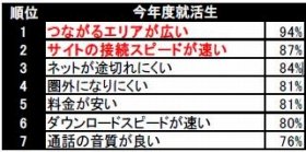 13年度就活生に、「就活においてスマホに求めること」を尋ねると、「つながるエリア」「接続スピード」が上位に上がっている。こうしたことから、就活生たちは、エントリーでチャンスを逃さないため、いつでもスマホがつながっている状態にしておきたいと考えており、少しでもつながりやすく、接続スピードも速いスマホを希望していると言えそうだ。ちまたでは「auのiPhoneがつながりやすい」との声が多いようだが、どうか。