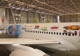 JALとスタジオジブリは1992年に、映画「紅の豚」を共同で制作し、07年には787の導入を見越して「『空を飛ぶ。』プロジェクト」を発足。国内の小学生を対象に、「あなたが乗って旅してみたい、空飛ぶ乗り物」をテーマに787の初号機のデザインを募集し、全国から約1万3474点の応募があった。最優秀賞1点と優秀賞6点が選ばれ、宮崎駿監督と受賞者の作品を組み合わせた機体の完成予想イラストも公表されていた。