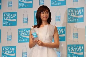 大塚製薬は2013年4月4日、カロリーオフで日常的に水分とイオン(電解質)が補給できる新たなイオン飲料「ポカリスエット イオンウォーター」の発表会を東京・港区内のホテルで開いた。"もう一つのポカリスエット"となる「ポカリスエット イオンウォーター」の発売開始は4月8日で、発表会にはCMキャラクターに起用された女優・深田恭子さんも駆けつけ「本当にすっきりした味」と笑顔を振りまいた。