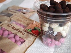 ここは、クジラ肉、アサリ佃煮や鉄砲漬、びわゼリーなど、幅広い千葉グルメを取りそろえ、もちろん千葉名産の落花生(ピーナツ)も豊富。殻ごと袋詰めにしたものや、みそピーナツなどが定番だが、店内で一際目を引くのは、透明のケースに山と積まれたカラフルな物体である。一見、コーヒー豆かキャンディーのようだが、じつはこれが千葉県産の落花生をカラフルにコーティングした「Rattsu」なるスイーツ。「秋葉原店限定の新開発商品」とのことだ。