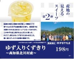 スリーエフは、製法や品質にこだわったブランド「FSTYLE」(エフスタイル)から、産地の見えるスイーツの第2弾デザート「ゆず入りくずきり~高知県北川村産~」を2013年8月2日から数量・地域限定で販売している。