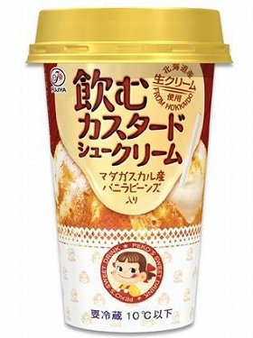 北海道産生クリームと卵黄、マダガスカル産バニラビーンズを使用し、ふんわりとした卵の風味が豊かな、なめらかな口あたりのカスタードクリームをドリンク仕立てにした。デザート感覚のリッチな味わいという。シュークリームのイメージ画像と、ペコちゃんのワンポイントが目印(ストロー付き)。