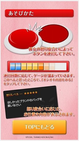 トップ画面で表示される大きなボタンをスマホ越しにひたすら連打すると、その回数に応じて彼氏への具体的なお仕置き方法が表示されるというゲーム。彼氏に対して不満を持つ彼女を対象に作られた。ボタンを連打すればするほど「怒り度合」を表した画面上のゲージが上昇していく。気の済んだところで連打をやめ、画面下の「オシオキ内容をみる」ボタンをタップするとゲージの上昇具合に応じて変化する様々なお仕置き方法が見られる。くれぐれもスマホを叩きすぎて壊さないように注意したい。Google Playから無料でダウンロードできる。