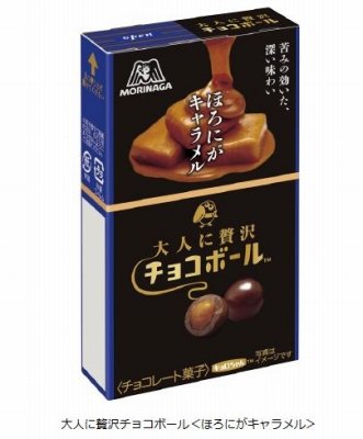 高級感あるパッケージ森永製菓(東京都港区)は、「大人に贅沢チョコボール」シリーズより「ほろにがキャラメル」を2014年9月24日に発売する。1967年の発売以来、ロングセラーになっている「チョコボール」を品質やデザインにこだわって大人向けにアレンジ。甘さと苦みのバランスが良いキャラメルとチョコレートを堪能できる。チョコレートは甘さを控えたマイルドビターを使用。1個146円(税別)。