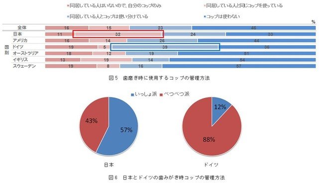 歯みがきする時に使用するコップの管理には国によって差があり、ドイツは約9割が「べつべつ派」なのに対して、日本では半数以上が「いっしょ派」という結果だった。