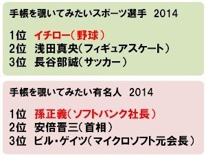 「有名人」の1位はソフトバンクの孫正義社長。2位に安倍晋三首相が入り、3位はマイクロソフト元会長のビル・ゲイツ氏だった。孫氏は3年連続1位。「多忙な生活の中でアイデアを生む工夫が手帳に書かれていないか」ということが気になる人が多かった。