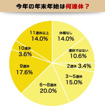 これに合わせて同社では「年末年始の過ごし方・お金の使い方」に関するインターネット調査を行った結果、年末年始の連休の日数は約4割が「9連休以上」で、大型連休になる人が多いことがわかった。