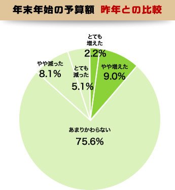 調査によると冬のボーナス額について7割以上が不満を感じており、年末年始の予算が昨年より増えた人はわずか1割だった。年末年始に使う金額は、「5万円未満」が6割を占め、予算が昨年より増えたと回答したのはわずか1割に留まっている。使い道には、「グルメ(外食、酒、料理、お取り寄せ)」「旅行」「ファッション」「読書・映画・音楽・ゲーム」などが上位にランクインした。調査は11 月10 ~12 日の3 日間、全国の20 ~60 代の男女500 人を対象に実施した。