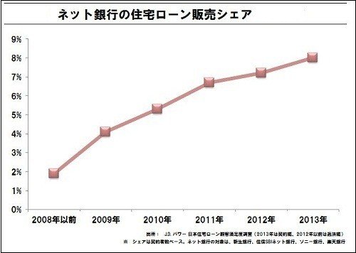 ネット銀行の住宅ローン取り扱いは02年に始まり、その後、シェアを着実に伸ばしてきた。13年は8%だった。