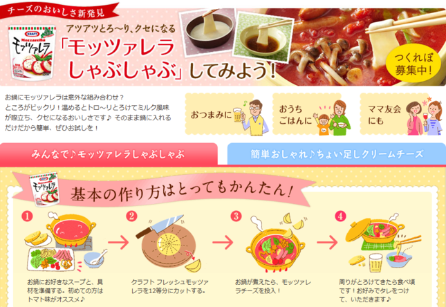 タレもラー油だれから、豆乳だれ、バター醤油だれまで何でもござれ。ツイッターでは「水炊き」「土手鍋」でも大丈夫と報告されているので、敢えて洋風鍋にしなくともいいだろう。モッツァレラチーズの「クセが無い」「味も薄くあっさりしている」という特徴を生かした調理法と言える。