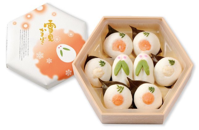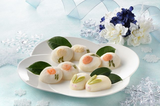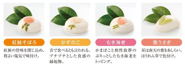 うさぎの耳をイメージしてほうれん草で色付けした「雪うさぎ」と、「むき海老」や「紅鮭そぼろ」、縁起物の「かずのこ」などの具材入りかまぼこがセットになっている。「洋菓子顔負けのかわいさ」のかまぼこは、皿に盛り付けるだけで手軽なオードブルとして食卓を演出できる。また、低脂肪、低カロリーなので「正月明けのつかれた胃袋にもおすすめ」だという。
