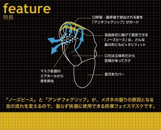 バイク乗りに限らず、屋外での作業や自転車の運転時など、寒さや風から顔や首をガードするフェイスマスクを着けるユーザーの悩みとしてあげられるのは、一般的なフェイスマスクでは、眼鏡やゴーグルが曇ってしまうこと。視界を遮られてしまっては、運転中は特に事故につながりかねない。