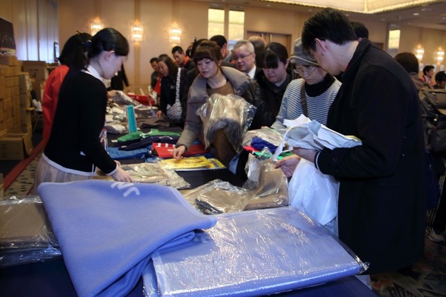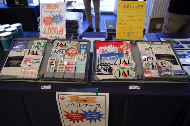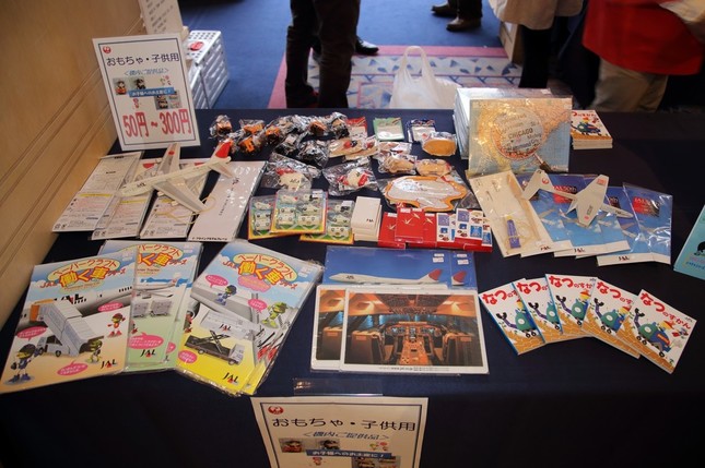 ポスター以外にも、機内食用の食器、子ども向けのペーパクラフトなどが大人気。オイル缶を整備士が加工して作った貯金箱も注目を集めていた。バザーは東日本大震災の影響が残る東北地方支援プロジェクトの一環で、鶴丸はっぴに身を包んだ大西賢(まさる)会長らが岩手県や宮城県産のコメを売り込んでいた。
