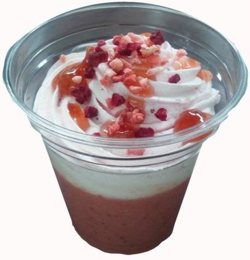デザート工場で製造されたホイップクリームを使い、ソースやナッツのトッピングで本格的な味わいを追求した。付属のストローはスプーン型になっているので、ホイップクリームだけを食べることもできる。