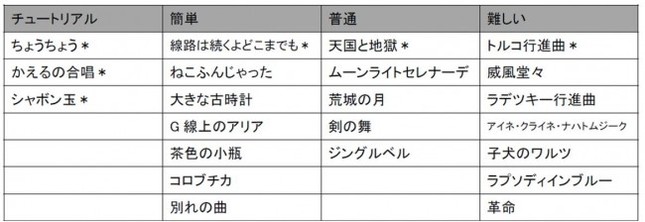 MIDI音源をアプリで使用できるデータに変換するための作業環境を独自に定義・構築したことで、さまざまな楽曲の取り込みが可能。「かえるの合唱」「ねこふんじゃった」「天国と地獄」「トルコ行進曲」など、22曲のなじみのある名曲が難易度別に収録されているという。