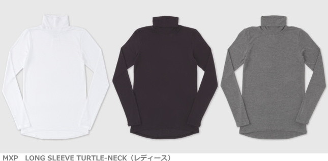 価格(税抜)は、MXP 8/10 SLEEVE V-NECK(8/10スリーブ・Vネック・メンズ)は5800円、MXP LONG SLEEVE TURTLE-NECK(ロングスリーブ・タートルネック・レディース)は6300円。