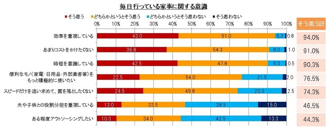 子どもの世話や仕事との両立を求められる「毎日の家事」について、回答者の女性らが最も意識していることは「効率よく行う」ことで、94.0%が「そう思う」と答えた。以下「コストをかけない」(91.0%)、次に「時短を意識する」(90.3%)が続き、これらは9割以上の回答者がチェックマークをいれた。