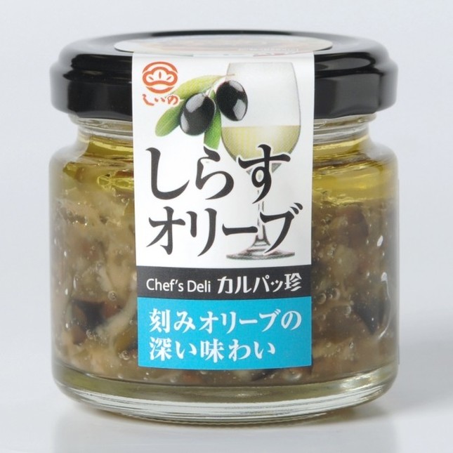 「しらすオリーブ」はブラックオリーブとしらすをマリネ風に仕上げた。後引く酸味とオリーブの香りがワインにぴったりの味わいだという。