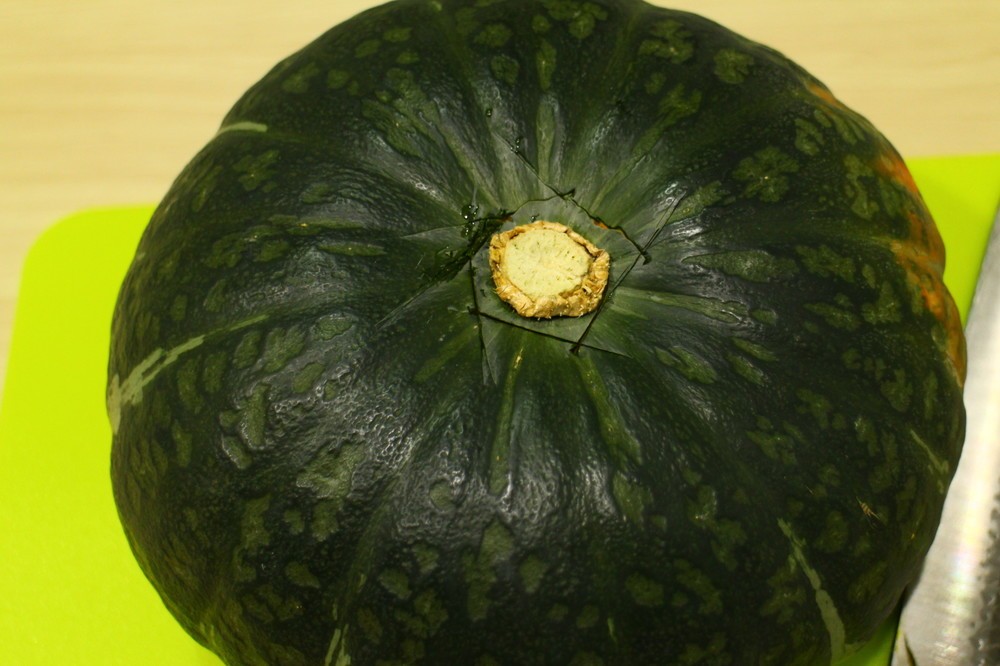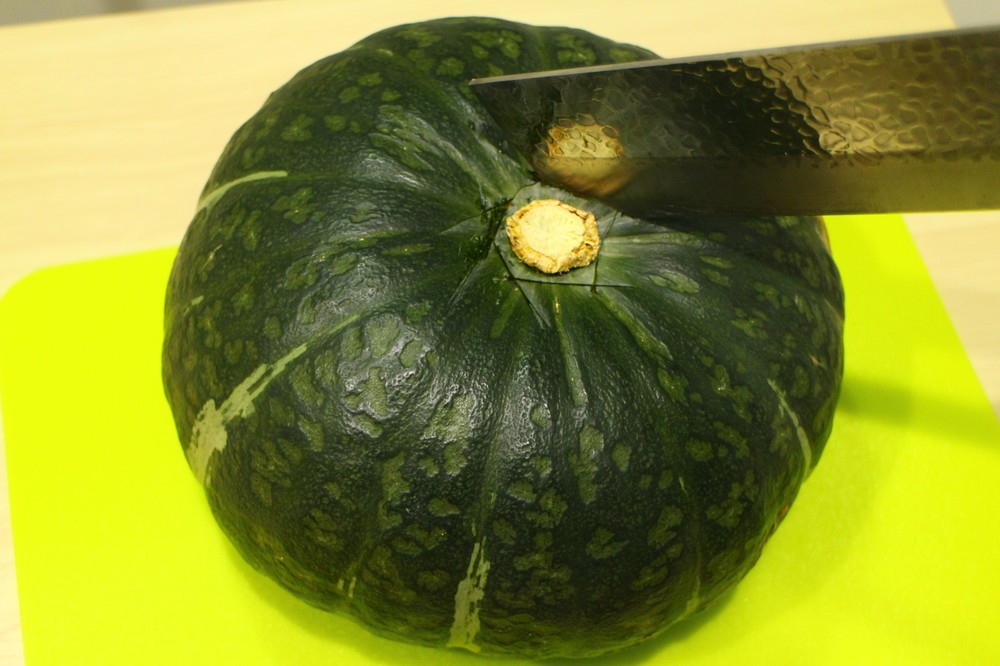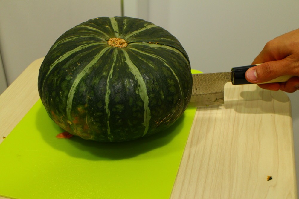 カボチャの下処理は厄介だ。表面が非常に堅く、正しく慎重に切らないと、手をケガする恐れがある。まずは安全簡単にカットする方法を確認しよう。カボチャはカットされた状態で売られていることが多いが、今回はあえて難易度の高い「1玉まるごと」に挑戦する。