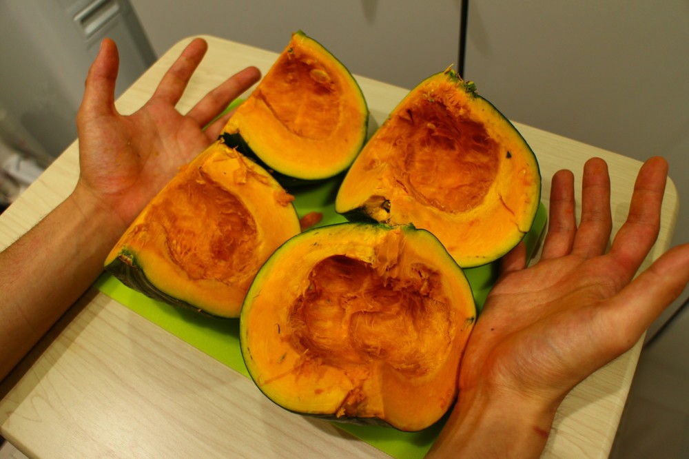 ここにレンジでチンして柔らかくなったカボチャがあるじゃろう?
