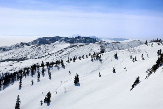 バックカントリースキーは北軽井沢の天然の雪山を専門のガイドと滑るプライベートツアー。「星のや」から車で60分かけて移動した場所から滑りを楽しむ。