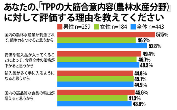 「TPPについて関心がありますか?」という問いに対しては、全体の53.4%が「ある」と答えた。男女別では男性が58.7%、女性が48.2%だった。また「TPPの大筋合意内容(農林水産分野)に対する考え」については、全体の69.1%が「評価する」と回答した。性別では男性の73.6%が「評価する」で、女性は63.7%だった。