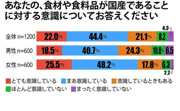 本調査では「食材や食料品が国産であることに対する意識」についても聞いた。「まあ意識している」が全体の44.4%、「とても意識している」が22.0%、「意識しているときもある」が21.1%、「ほとんど意識していない」が8.2%、「まったく意識していない」が4.3%だった。