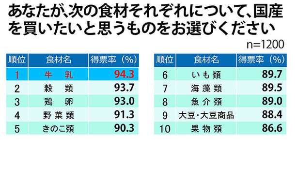 そして「国産を買いたいと思う=重視する食材は?」という問いに対して、「牛乳」は94.3%の得票率で、「穀類」の93.7%を抑えて1位となった。以下、「鶏卵」が93.0%、「野菜類」が91.3%、「きのこ類」が90.3%と続く。