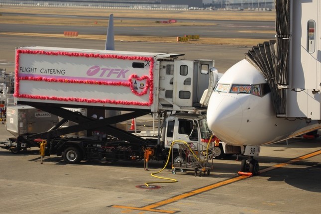 コンテナや機内食を運ぶトラックにはひな人形のイラストが彩を添える。ひな飾りで華やぐ搭乗ゲートには、普段から乗客に接しているCA以外にも、整備士、グランドハンドリング(地上支援業務)、ラウンジ、給油、機内食といったあらゆる職種の人が一堂に会した。「ひなまつりフライト」の目的地、小松空港(石川県小松市)にちなんで小松市のゆるキャラ「カブッキー」も姿を見せ、スタッフはひなあられを振舞いながら乗客を見送った。