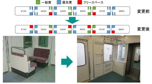 車両の一部にあったクロスシートを撤去しフリースペースにすることで、車いすやベビーカーが通りやすくし、大きな荷物を持つ人が移動しやすいようする。フリースペースはこれまで6両1編成につき2か所だったが、すべての車両に備え計6か所に増える。また、混雑時に座る客に手荷物が当たるのを防ぐため、座席横の仕切りを大型化する。