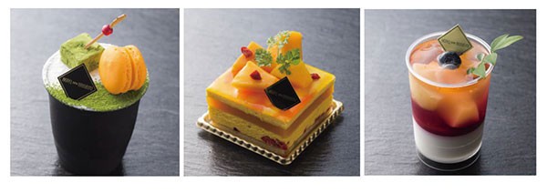 「抹茶のティラミス」は、京都産宇治抹茶のほろ苦いティラミスとマンゴーを組み合わせた。「マンゴーシブースト」はカスタードクリームとメレンゲのムースでマンゴーゼリーをサンドし、アップルマンゴーをトッピング。「桃のベリーヌ」はロゼワインジュレ、フランボワーズジュレ、パンナコッタの3層からなるベリーヌで、角切り桃が入っている。