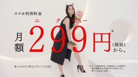 フリーテルのCM「スマホ利用料金 ニクキュー時代へ」(30秒)では、佐々木さんが「ニクキュー」を9回連呼した後、「乗り換えよう♪」と視聴者を誘う。