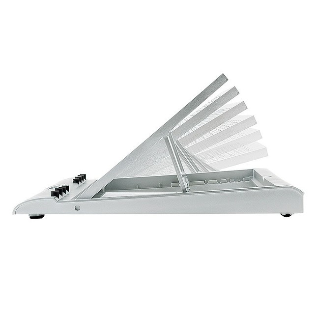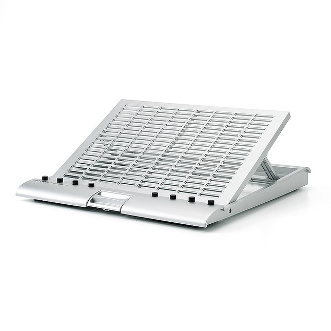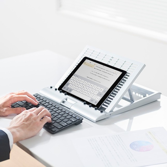天板角度を15度から45度までの6段階で調整できるのが特長。自然と視線が上がるので長時間のデスクワークでも正しい姿勢で快適に使用できる。スタンド裏面には表面のボタンで操作可能なローラーを5ヶ所に内蔵。前後スライドと左右回転が可能で、好みの位置に移動させられる。