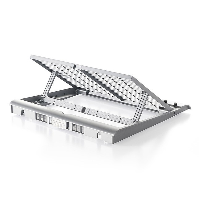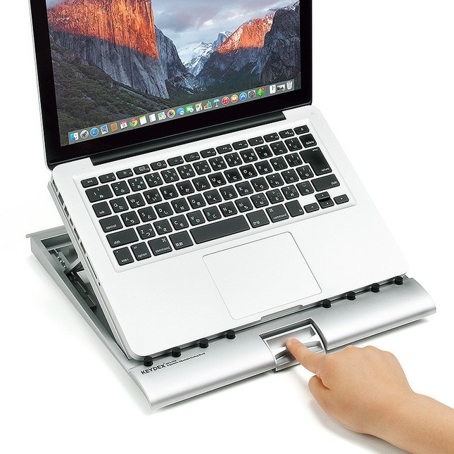 本体設置面には滑り止めのゴムが付いており、ノートパソコンはもちろんタブレットも設置しやすい。キーボードと併用することで、タブレットをノートパソコンの様にも使用できる。本体を設置する天板は通気性の良いメッシュ加工を施している。機器の熱がこもりにくく、「夏場や長時間作業時に最適」という。