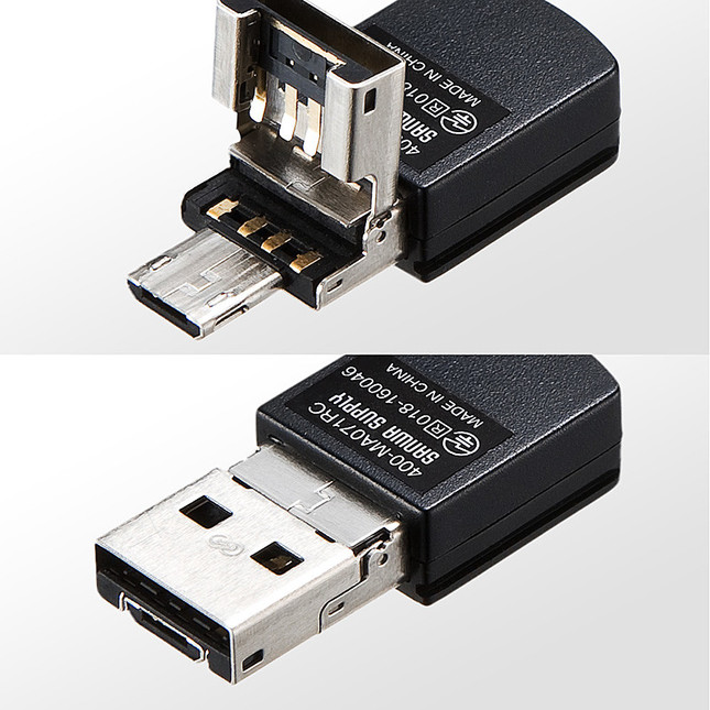 レシーバーが「USB Aコネクタ」と「microUSBコネクタ」の2種類のコネクタに対応したマウス。コネクタ部分が跳ね上げ式になっており、接続する機器に合わせて変換可能。一般的なマウスにはどちらかのコネクタでしか接続できないものが多いが、「400-MA071」ではパソコンと接続する際には「USB Aコネクタ」、スマホやタブレットと接続するには「microUSBコネクタ」と使用シーンによって使い分けることが出来る点が特長。