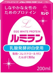 「ルミラン」は1本当たり8gのたんぱく質が入った、紙パック入りのプロテイン飲料。良質なたんぱく源として知られる卵白を乳酸菌で発酵させて飲みやすく加工した"乳酸発酵卵白"を使用。ヨーグルトのようなコクとすっきりとした酸味が特長。運動習慣のある女性がスポーツ後に飲むことを想定し、甘さは控えめで、なめらかな口当たりに仕上げたという。