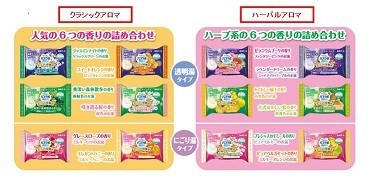 気軽に試せるように12錠入から6錠入に変更。人気の香りを詰め合わせた「クラシックアロマ」と、ハーブ系の香りを詰め合わせた「ハーバルアロマ」の2種類をラインアップした。