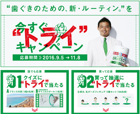 ロッテの「キシリトール オーラテクトガム」は、2016年9月5日から「今すぐ『トライ』」キャンペーンを始める。商品のCMキャラクターを務める、ラグビーの五郎丸歩選手にちなんだ賞品をプレゼントする。応募締め切りは11月8日まで。