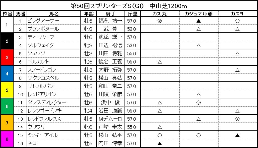 カスヨ 同じ8歳でも7番スノードラゴンは可能性ありよ。なんといってもG1を勝ったことがあるのは低力がある証拠。12番レッツゴードンキもG1馬だから要注意よ。夏に活躍した6番ベルカント、16番ネロは夏に走りすぎかもね。ベルカントはラチ(柵)沿いに最初に逃げて走れば強いかもしれないけど。今回は前に行きたがる馬が多いしね。ネロはセントウルでビッグアーサーに負けたけど2着に頑張った。スピードが付いたけど、ちょっと多くのレースに使いすぎかもね。14番ウリウリも最近の成績が今ひとつだしね。